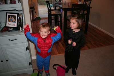 I've been keeping myself busy with the kids while Jeremy finished up his OB/GYN rotation. We counted the hours he was at the hospital and including overnight call (nights he spends at the hospital) he worked over 110 hours in one week. One of those overnights was the night of Halloween, so the kids and I went to a few friend's houses to trick or treat and then spent the rest of the night handing out candy to the kids in our neighborhood. I even attempted to take a shot with the three of us but my arms aren't long enough and cut out most of poor Davis. Most of these pictures were taken with my cell phone, so they're not great, but they are all I have!